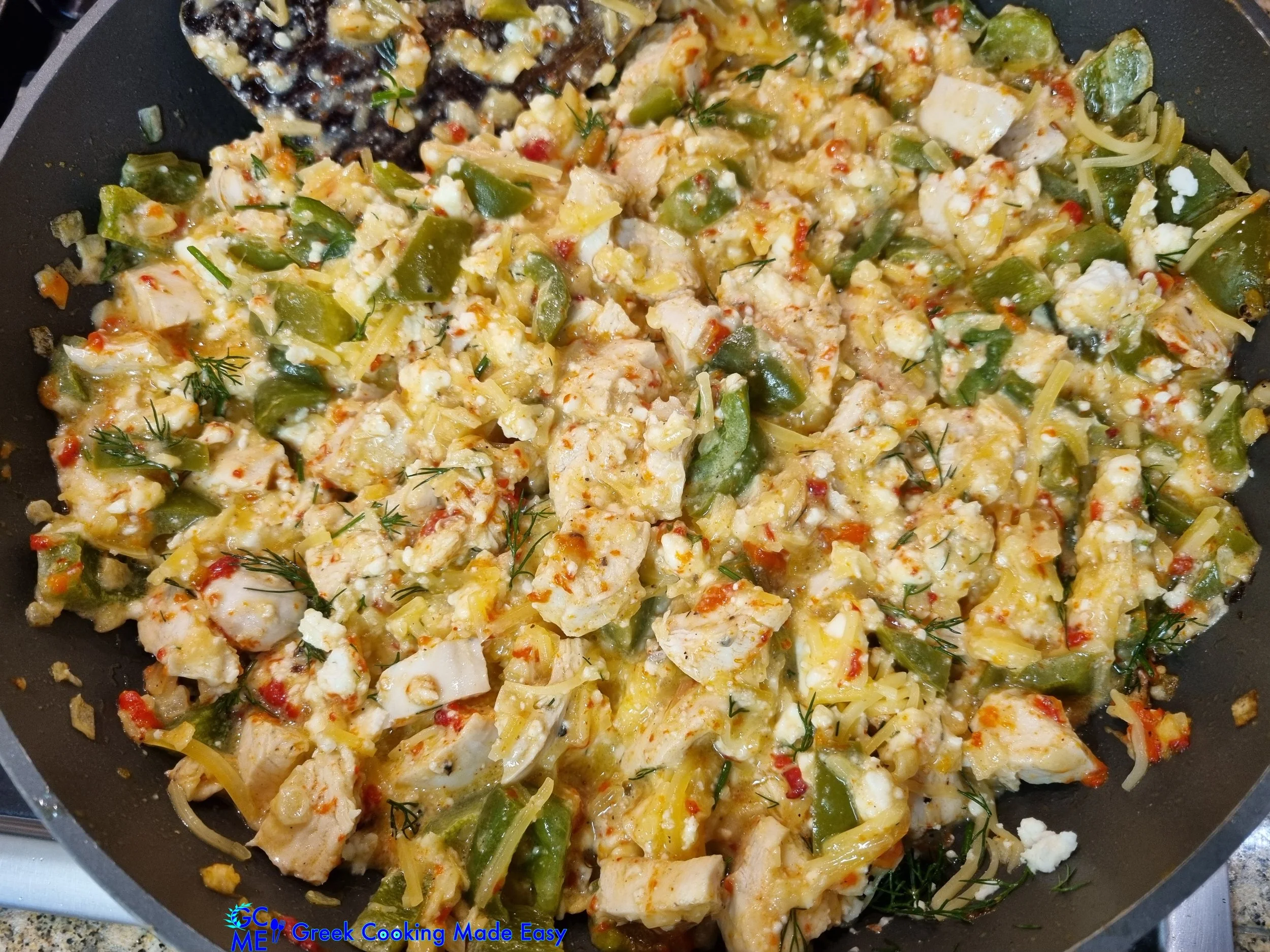 The lush filling of chicken, tangy and zesty Feta, semi-salty grated Kefalograviera and peppers are perfectly paired with the crispy, thin, delicate pastry!