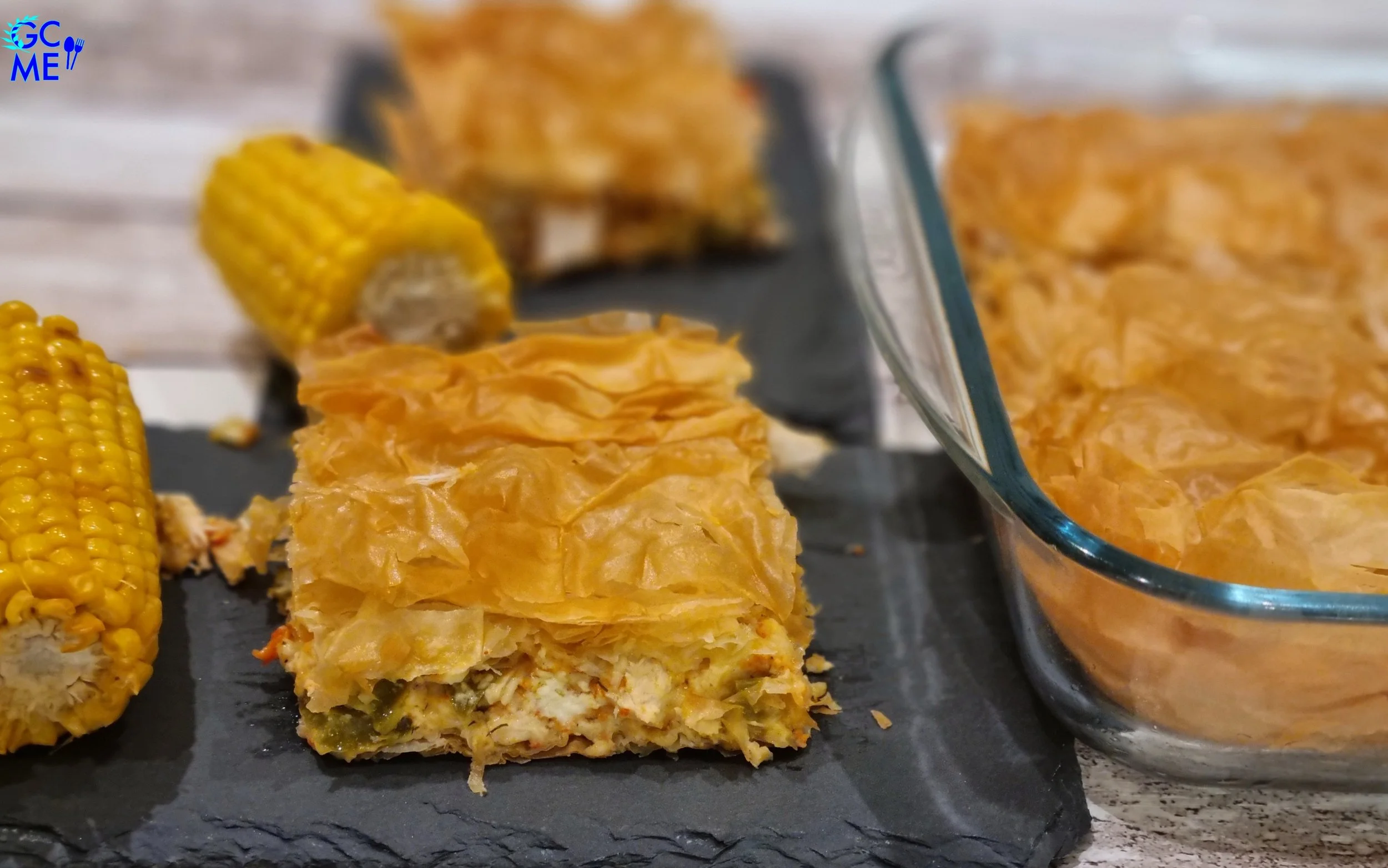 Παρασκευασμένη με μια πικάντικη, πλούσια γέμιση από κοτόπουλο, τυριά, μυρωδικά και λαχανικά, όμορφα τυλιγμένη σε τραγανό φύλλο, δημιουργεί μια ελκυστική, αξέχαστη πίτα.