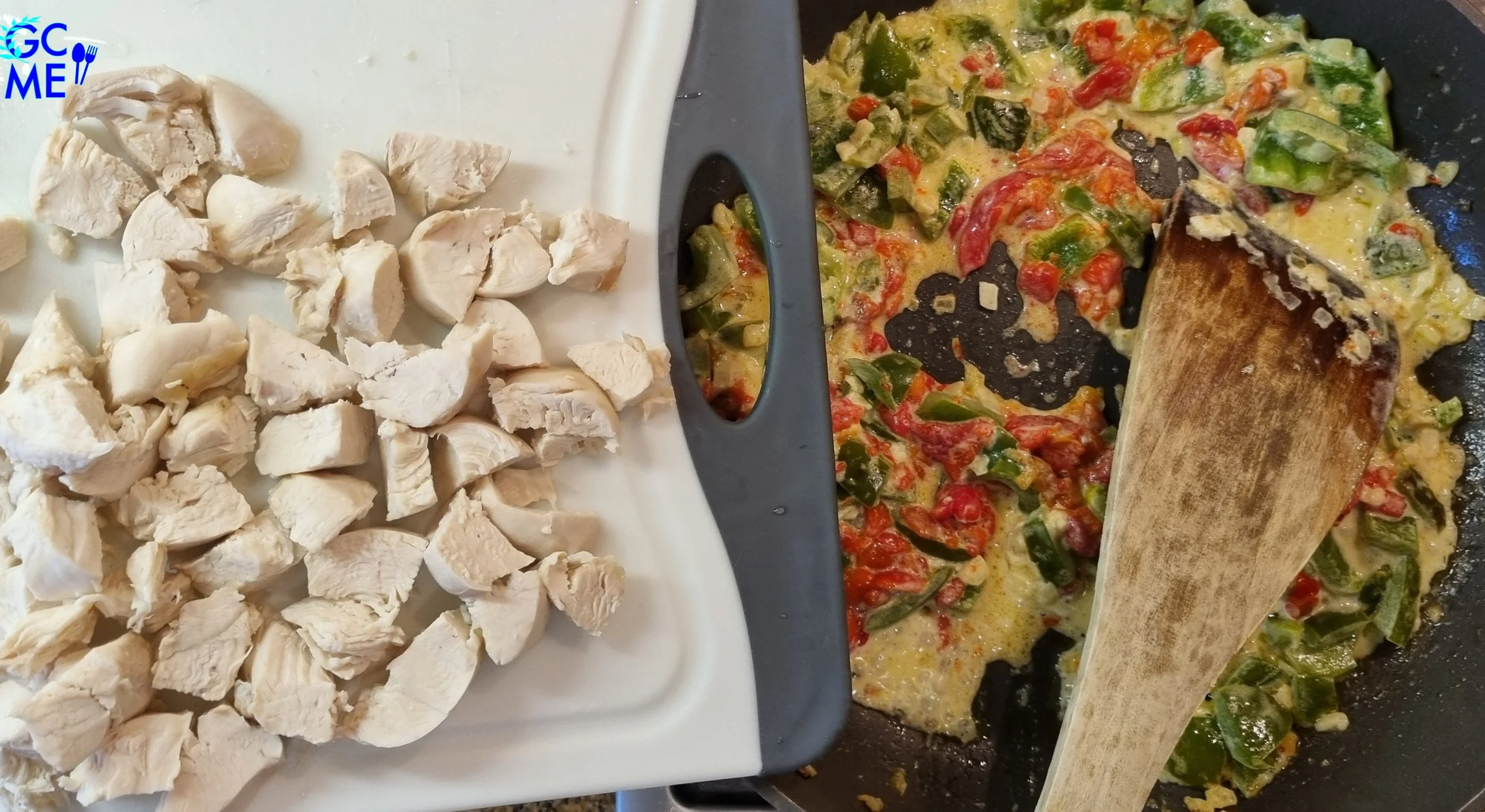 7. Reduce heat and pour the cream on top together with the strips of roasted red pepper. Stir to mix ingredients.