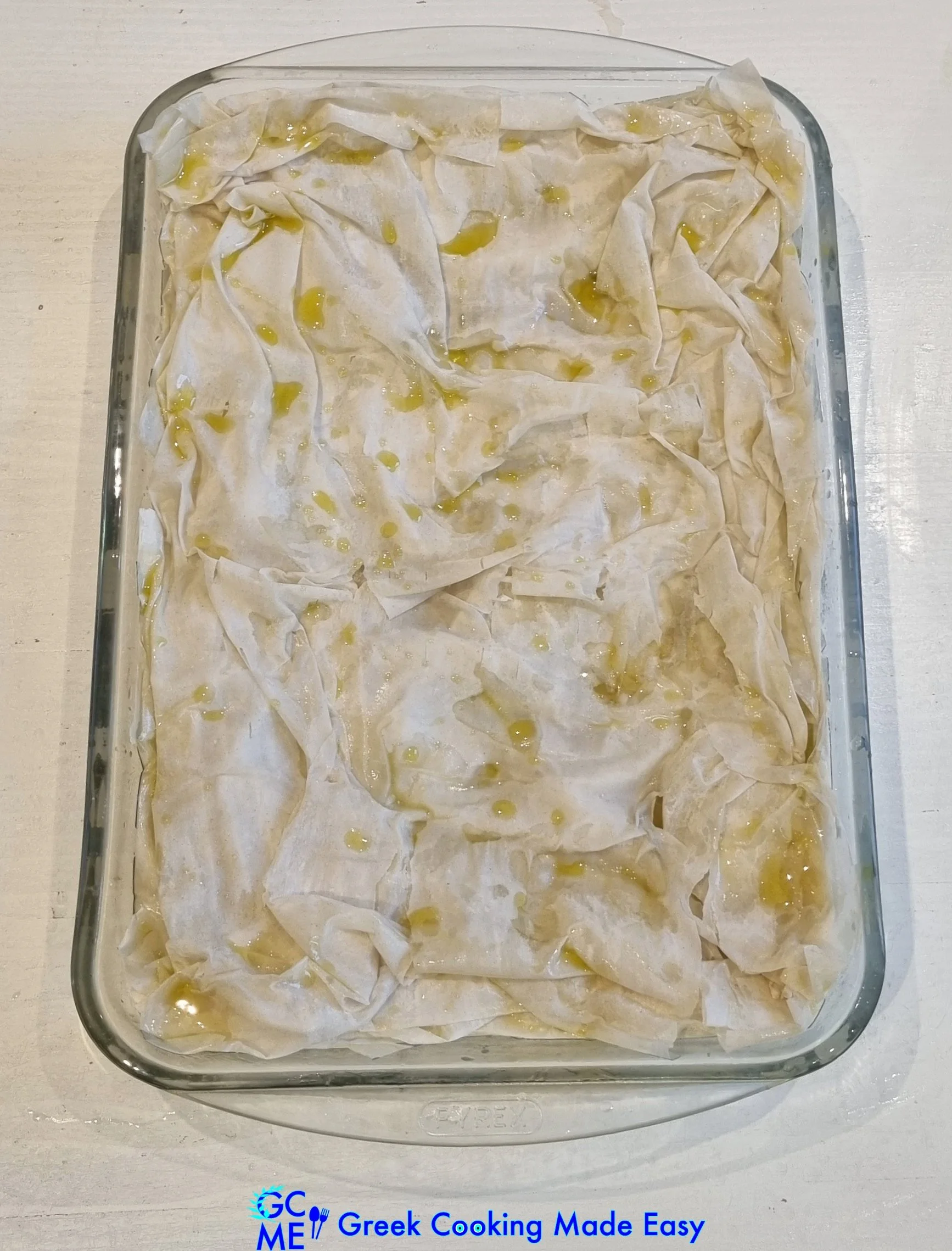 23. Then, start layering the 6 top sheets of phyllo, drizzling some oil on top of each layer.