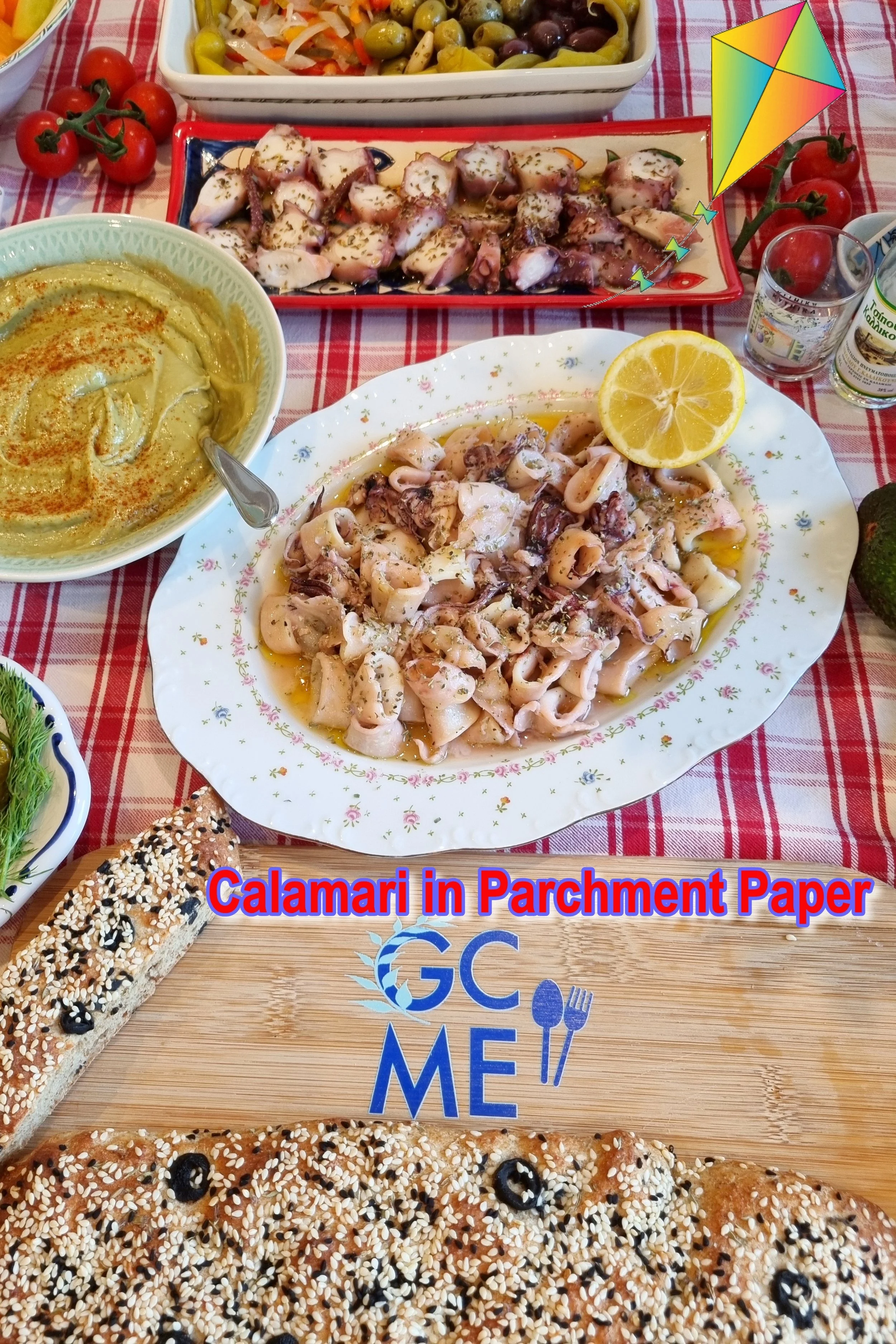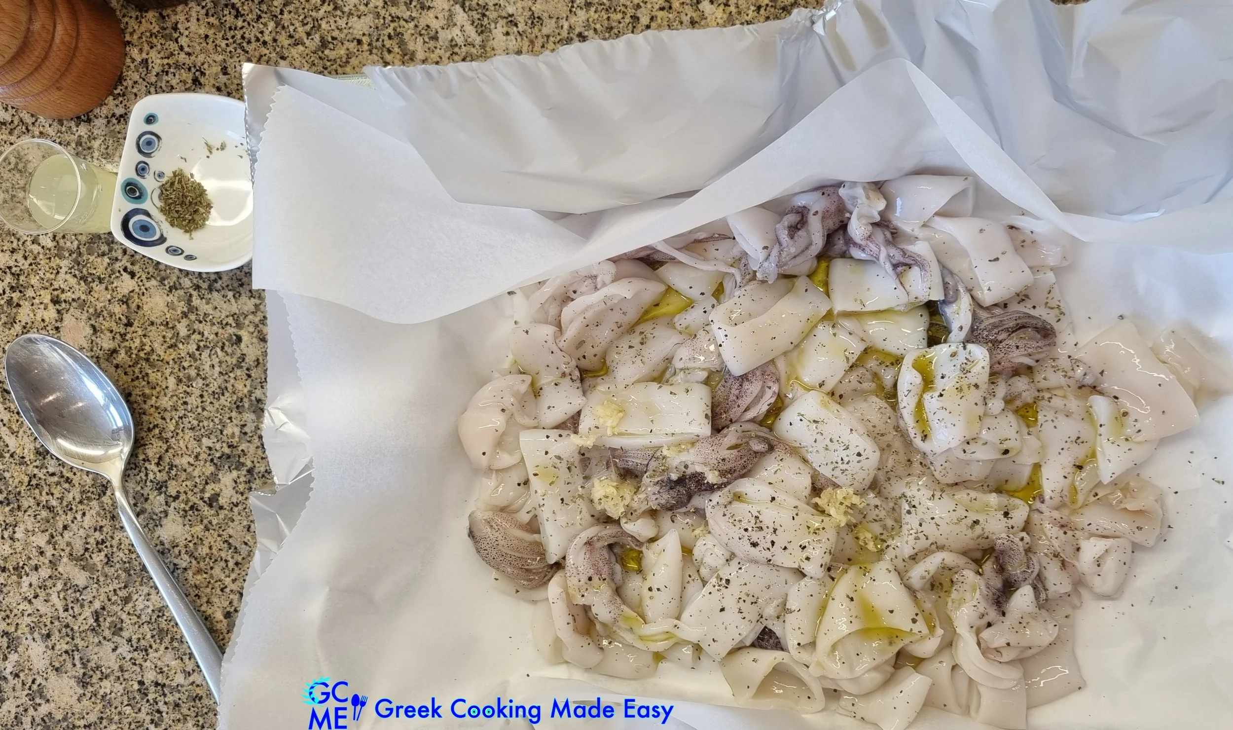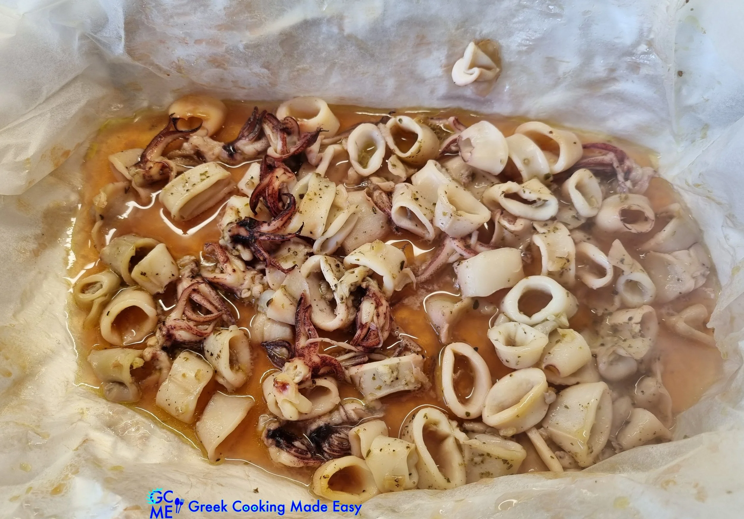 Baked Calamari (Squid) in parchment paper - Kalamarakia sti Ladokolla