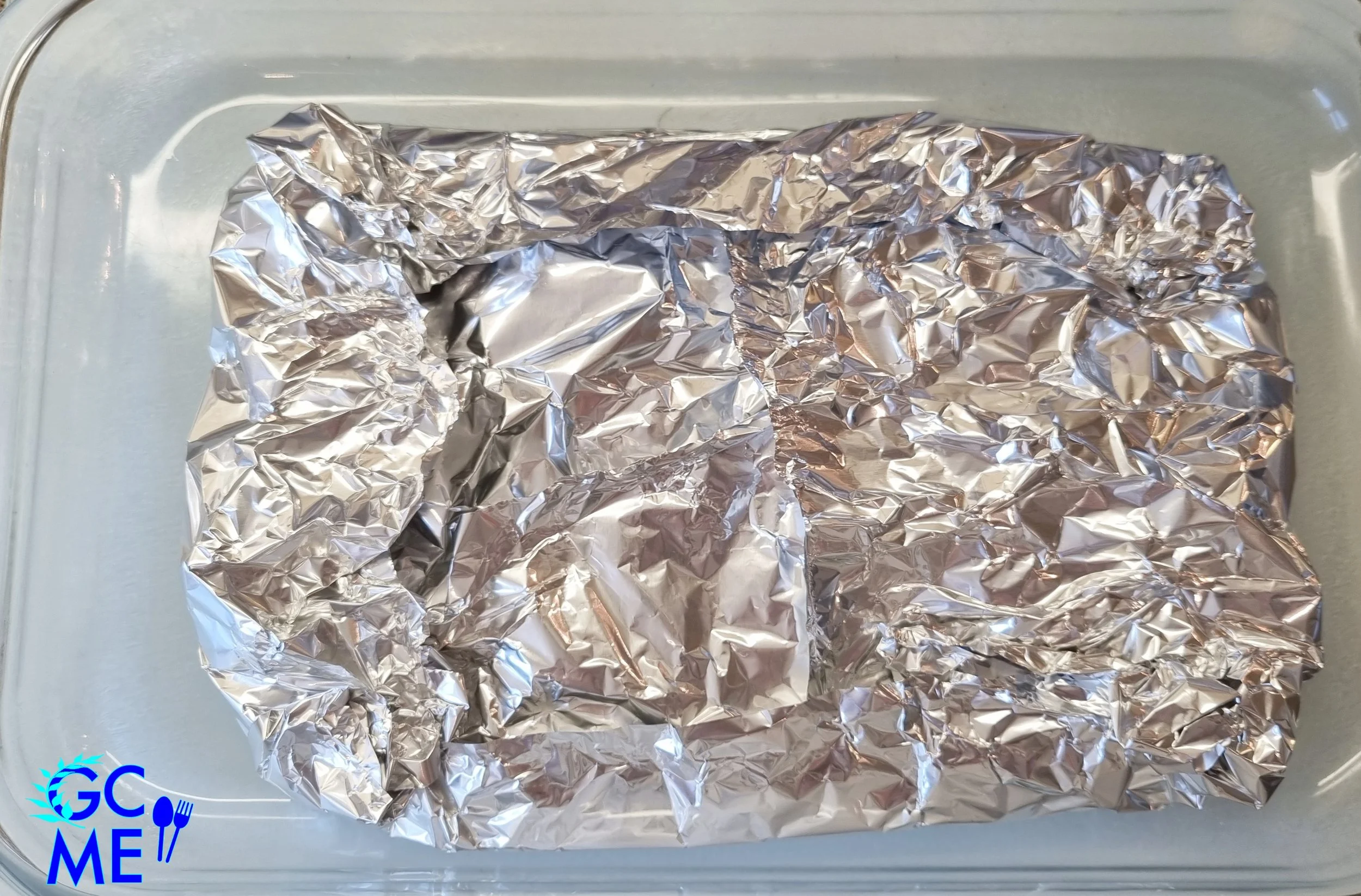 11. On a Pyrex pan, place cross-wise two large pieces of aluminum foil.