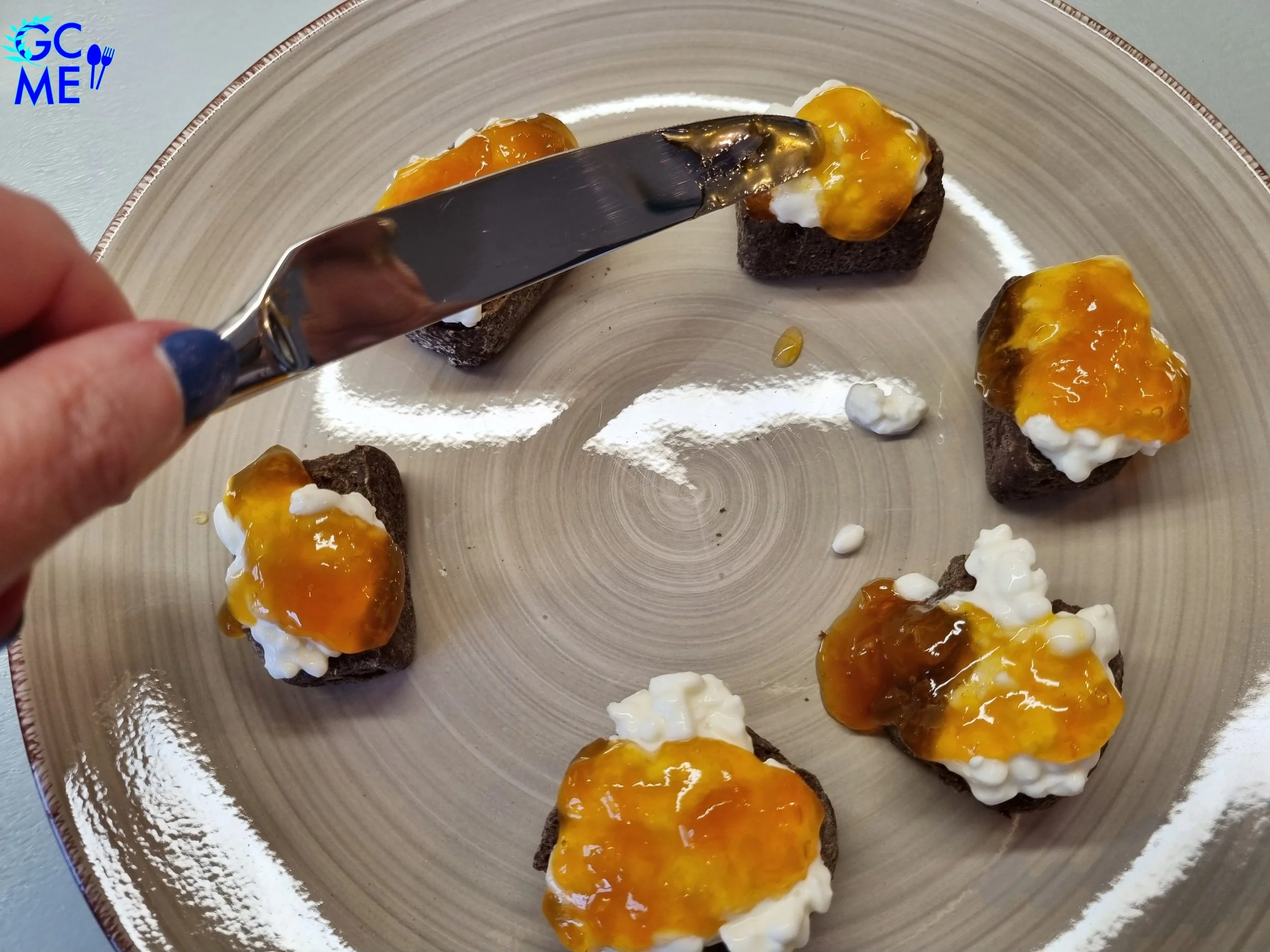 5. Take a tsp. of cottage cheese and place on top of each rusk followed by an equal portion of the jam.