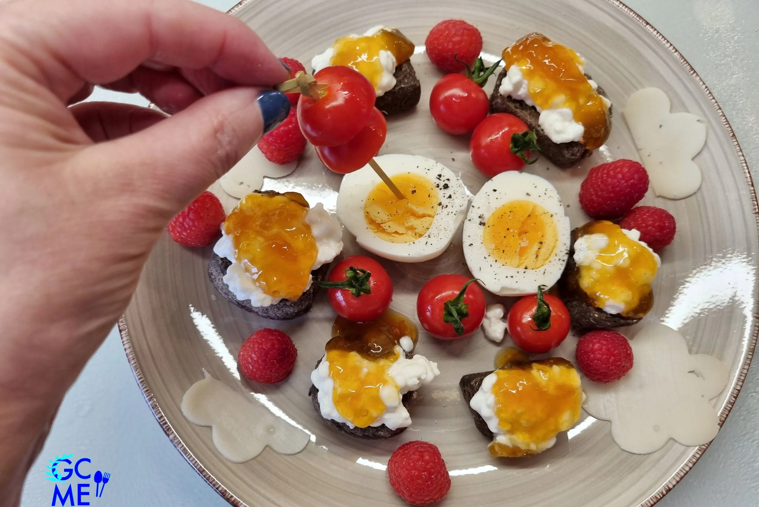8. Spread around the mini tomatoes and finish off by piercing two halved mini tomatoes through a cocktail skewer and placing it on top of a halved egg.