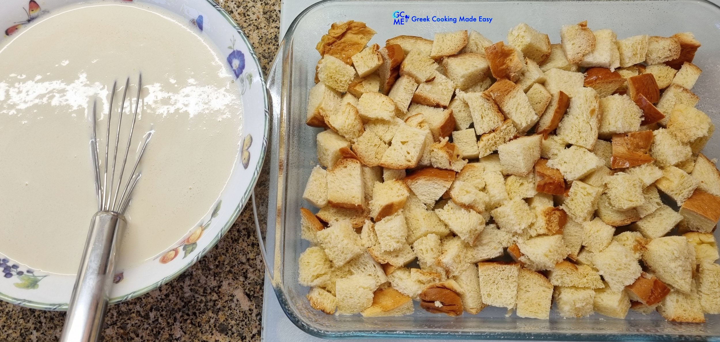 7. With a ladle, start pouring the liquid pudding mix on top of the tsoureki cubes, until all are soaked with it.