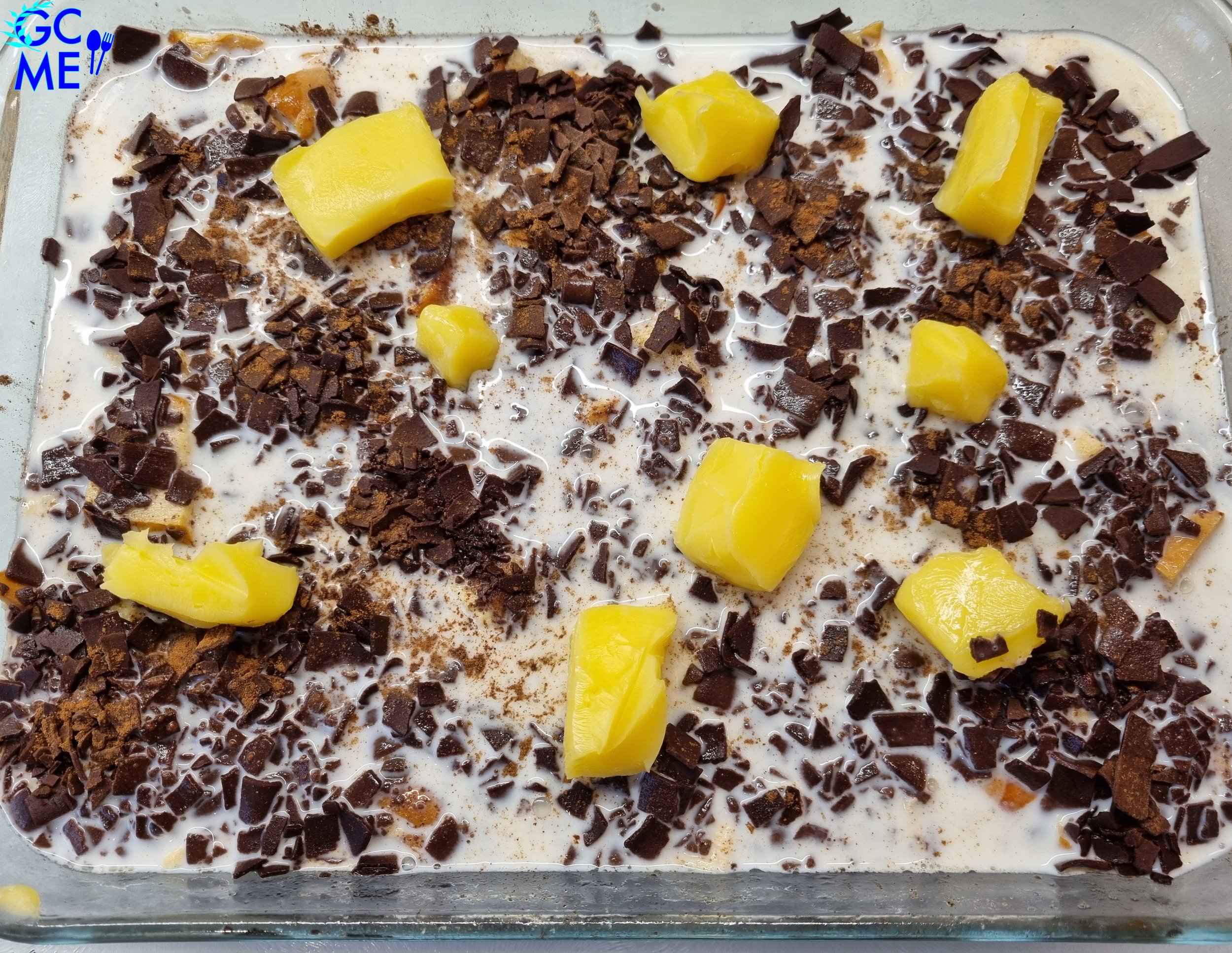 12. Cut butter in 8 cubes and distribute them on top. Pudding is now ready to be baked.