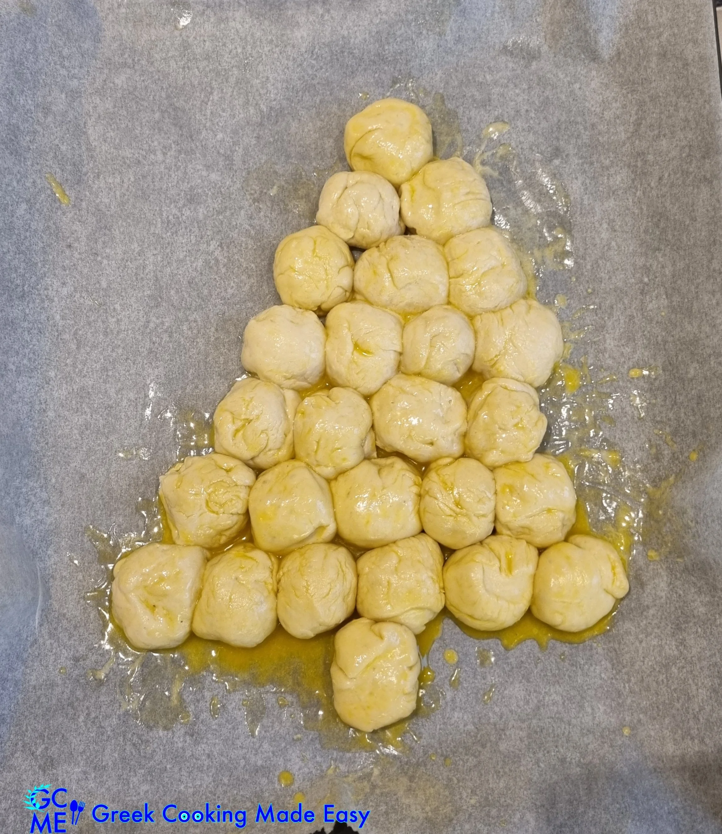 22. Συνεχίστε με τα υπόλοιπα ψωμάκια, επαναλαμβάνοντας τη διαδικασία και τοποθετώντας τα το ένα ελαφρώς ενωμένο με το άλλο, σχηματίζοντας μια πυραμίδα (χριστουγεννιάτικο δέντρο).