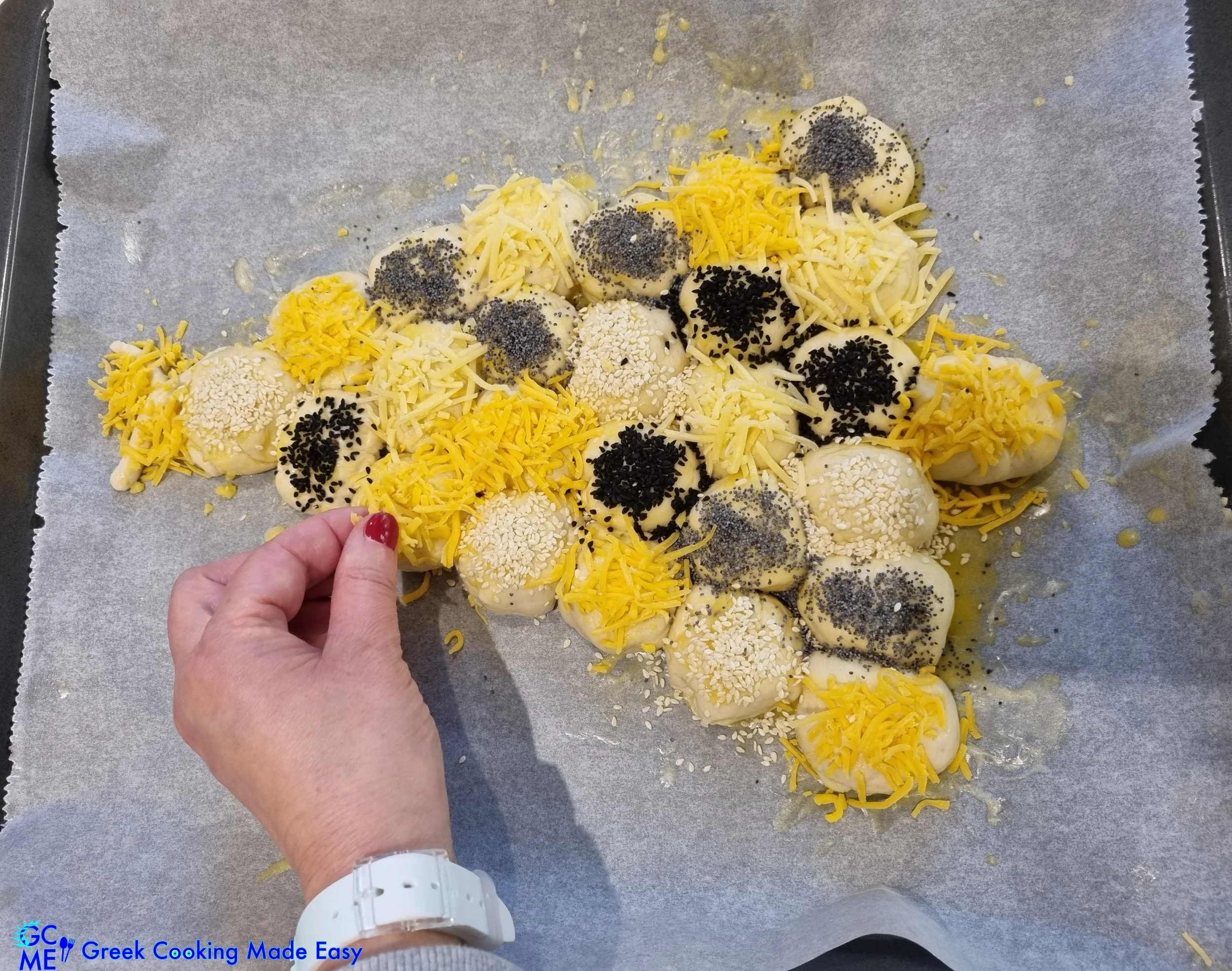 28. Ψήστε το ταψί με τα ψωμάκια σε προθερμασμένο φούρνο στον αέρα στους 180 ℃ / 350 ℉ για περίπου 25' ή μέχρι τα ψωμάκια να φουσκώσουν και να ροδίσουν και τα τυριά να λιώσουν (εξαρτάται από τον φούρνο).