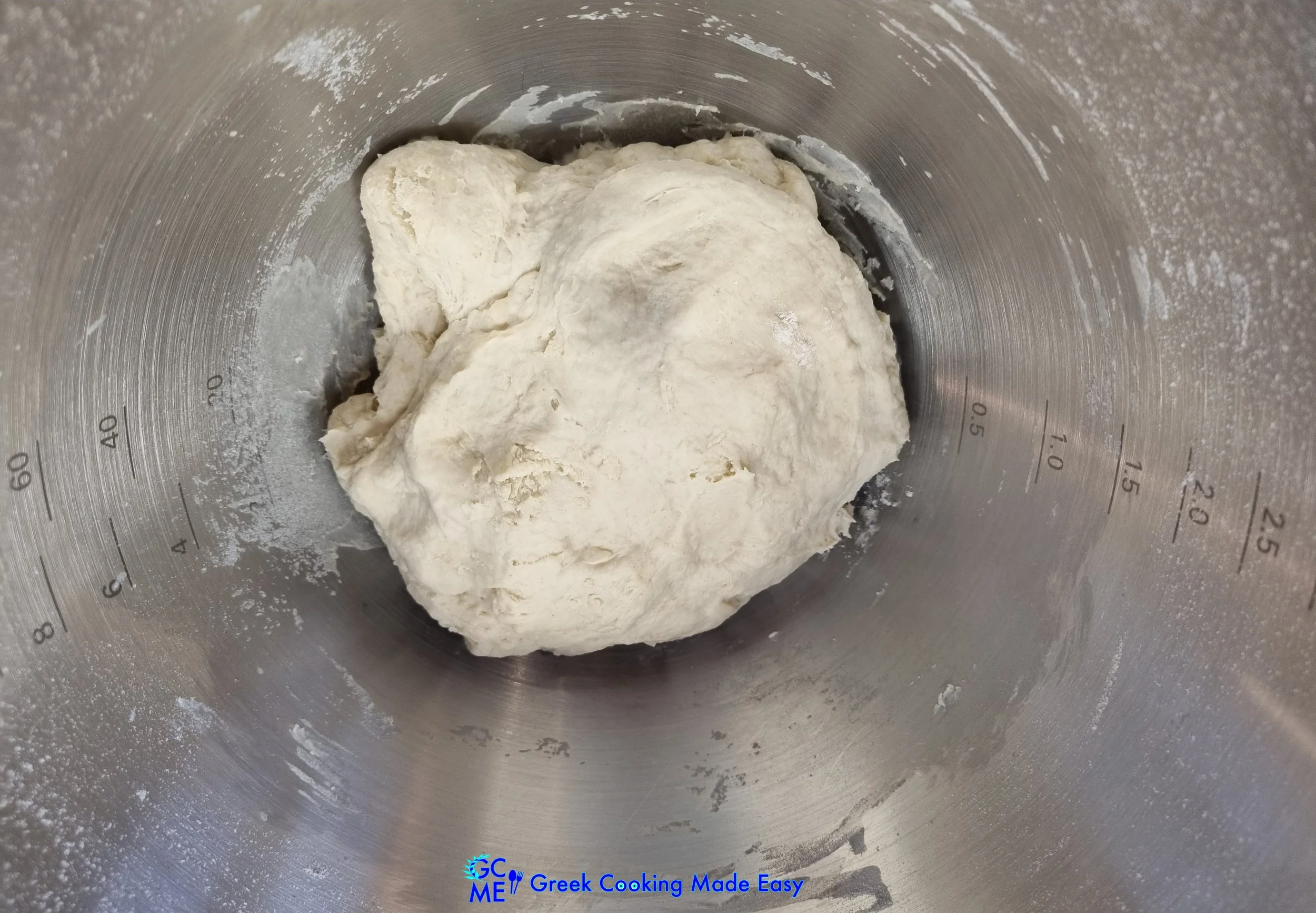 7. After about 5'-7', you will notice that the dough becomes one mass (lump) around the hook and has detached from the bowl. Stop the mixer.