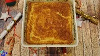 12. Brush with the 1 tbsp. melted butter the bottom and sides of a rectangular oven dish of 22 x 22 cm / 8.7 x 8.7 in. (suitable for Soufflé-preferably with festive decor-should hold about 6 cups / 1.5 lt. liquid).