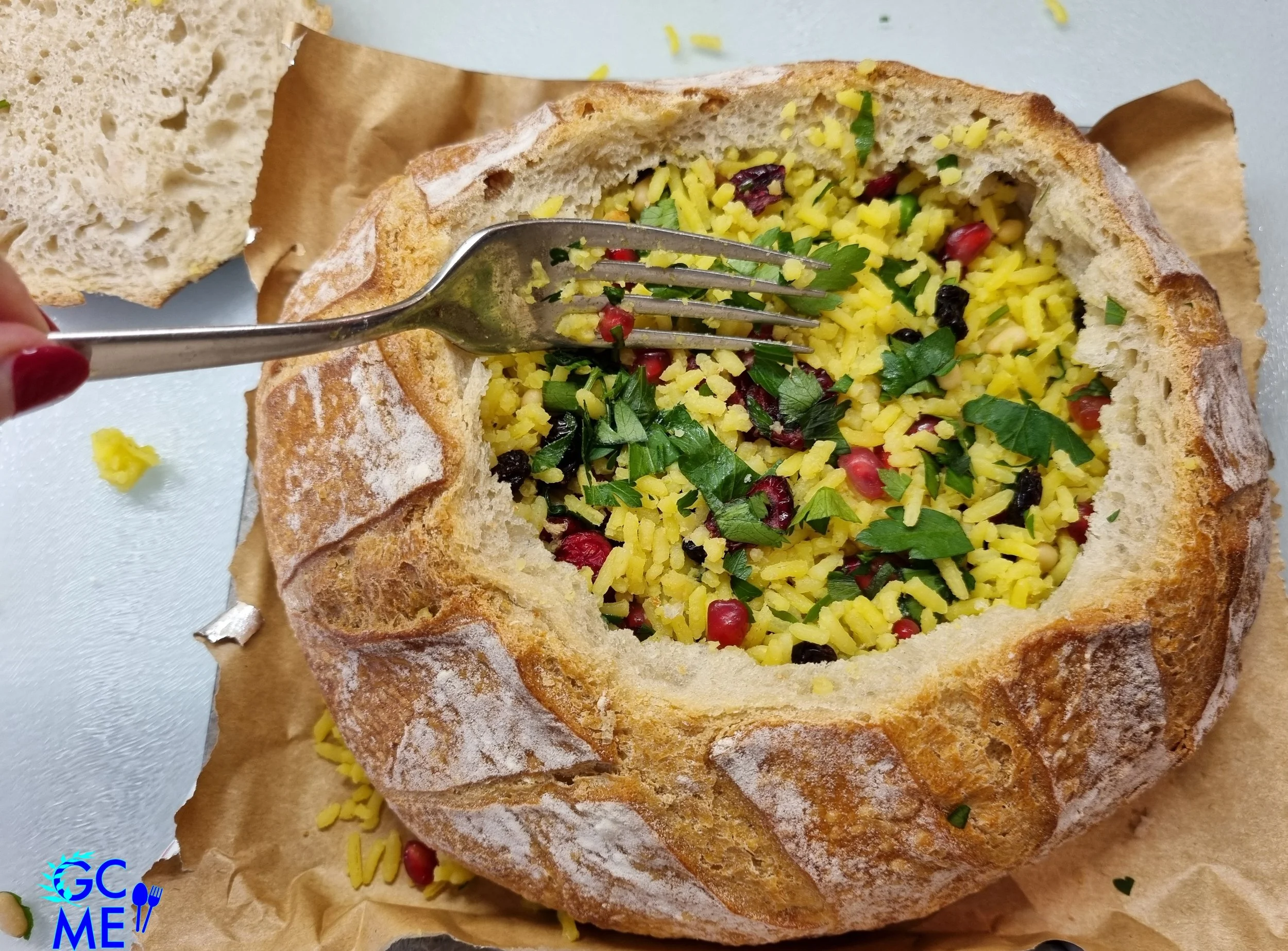 You open the lid of the bread and what a surprise! This golden looking rice with turmeric, earthy peas, juicy cranberries and raisins, crunchy roasted pine nuts, refreshing pomegranate and fragrant parsley will surely impress your guests and will become the ideal centerpiece for your Holiday season festive table.
