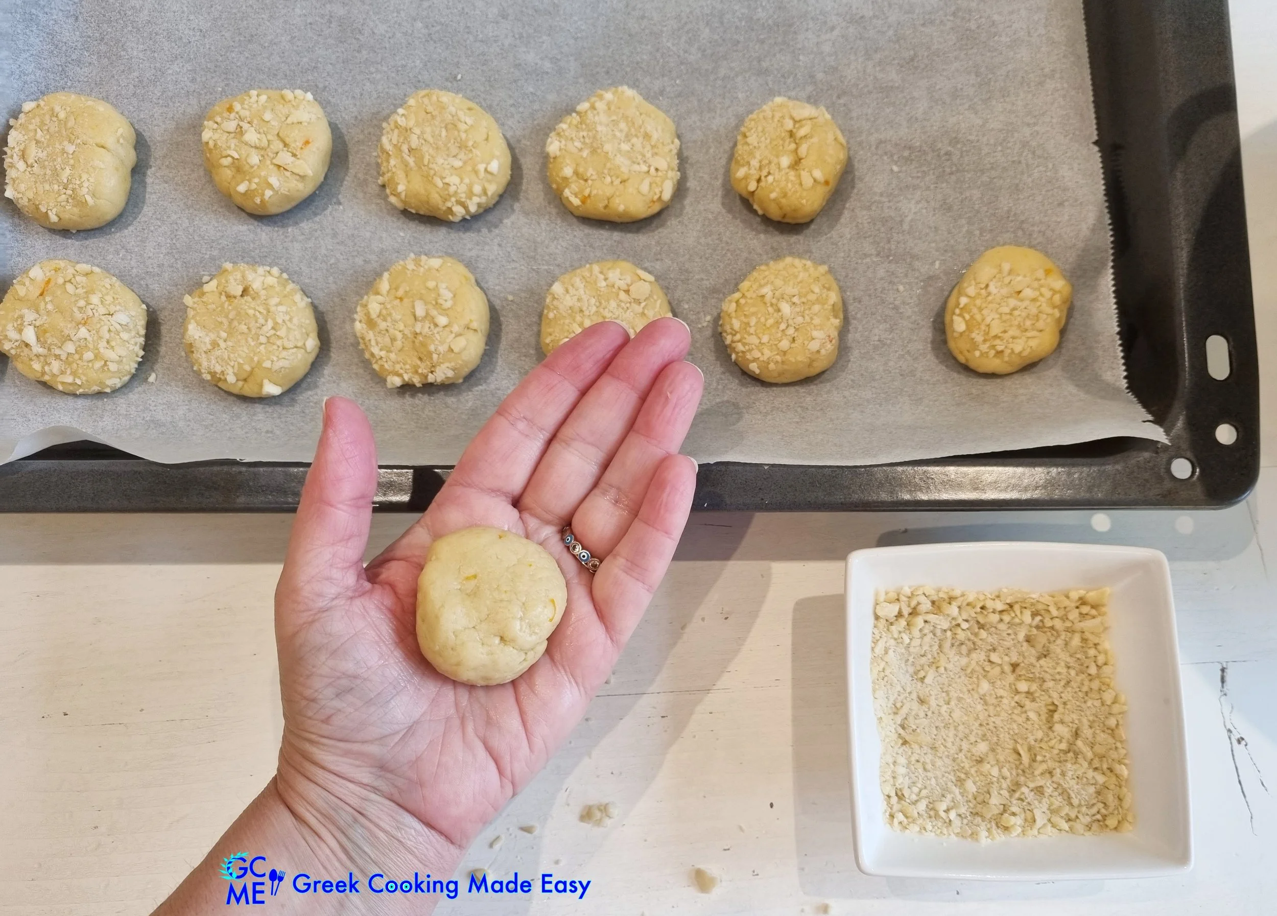 12. Optionally (if using almonds-highly recommended), place the chopped almonds in the bowl and dip half of the cookies pressing them so the almonds will stick well on their surface.
