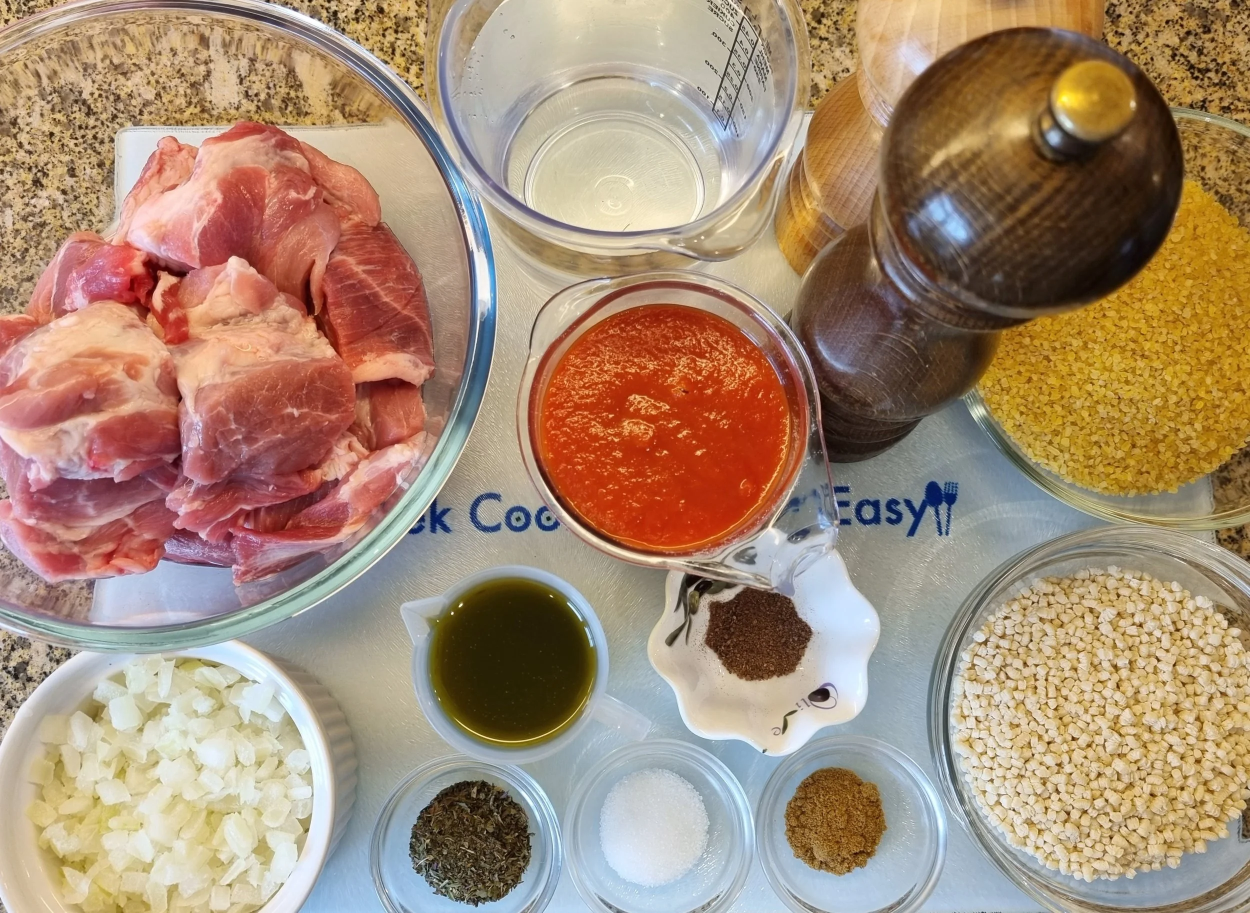 This one is a super easy, but delightful Northern Greek dish of pork which roasts slowly in the oven together with trahana and bulgur.