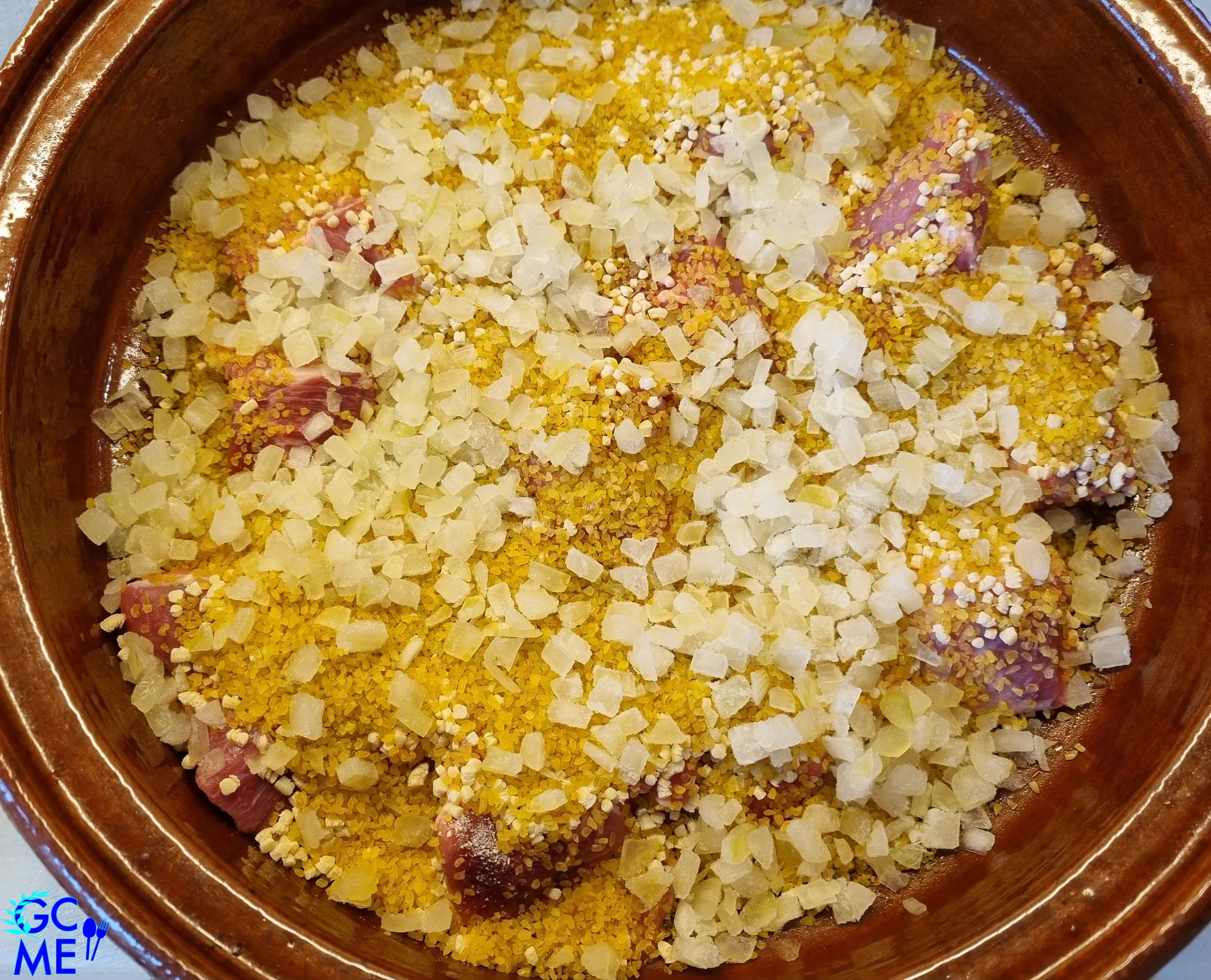 Greek Rustic Traybake (sheet pan) of Pork with Trahana and Bulgur - Hwriatiko Hirino sti Yastra me Trahana kai Pligouri