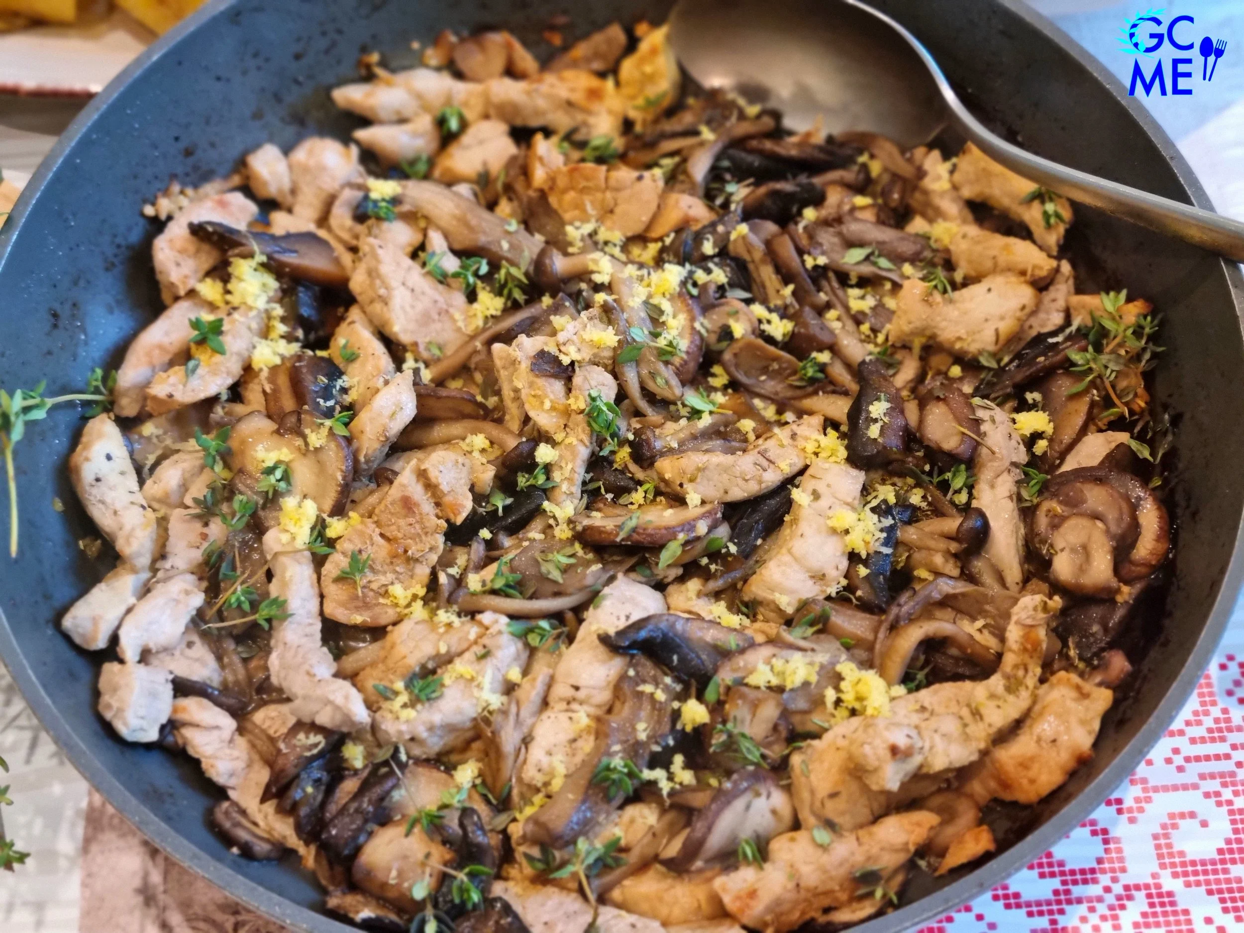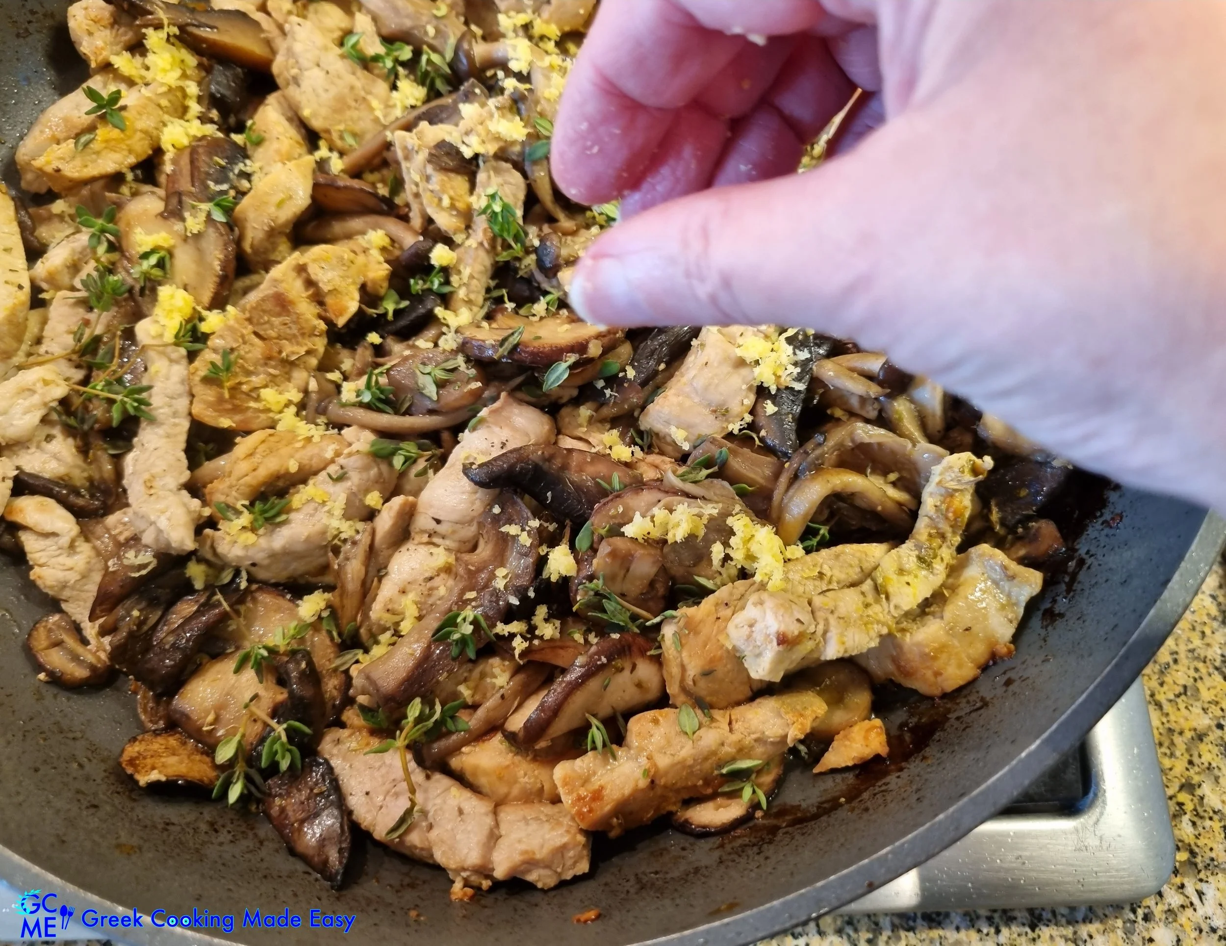 This easy and quick one-pan dish has a distinctive Greek name "Tigania", to describe the way it is prepared: in a 'Tigani' i.e. a pan where it is stir-fried.