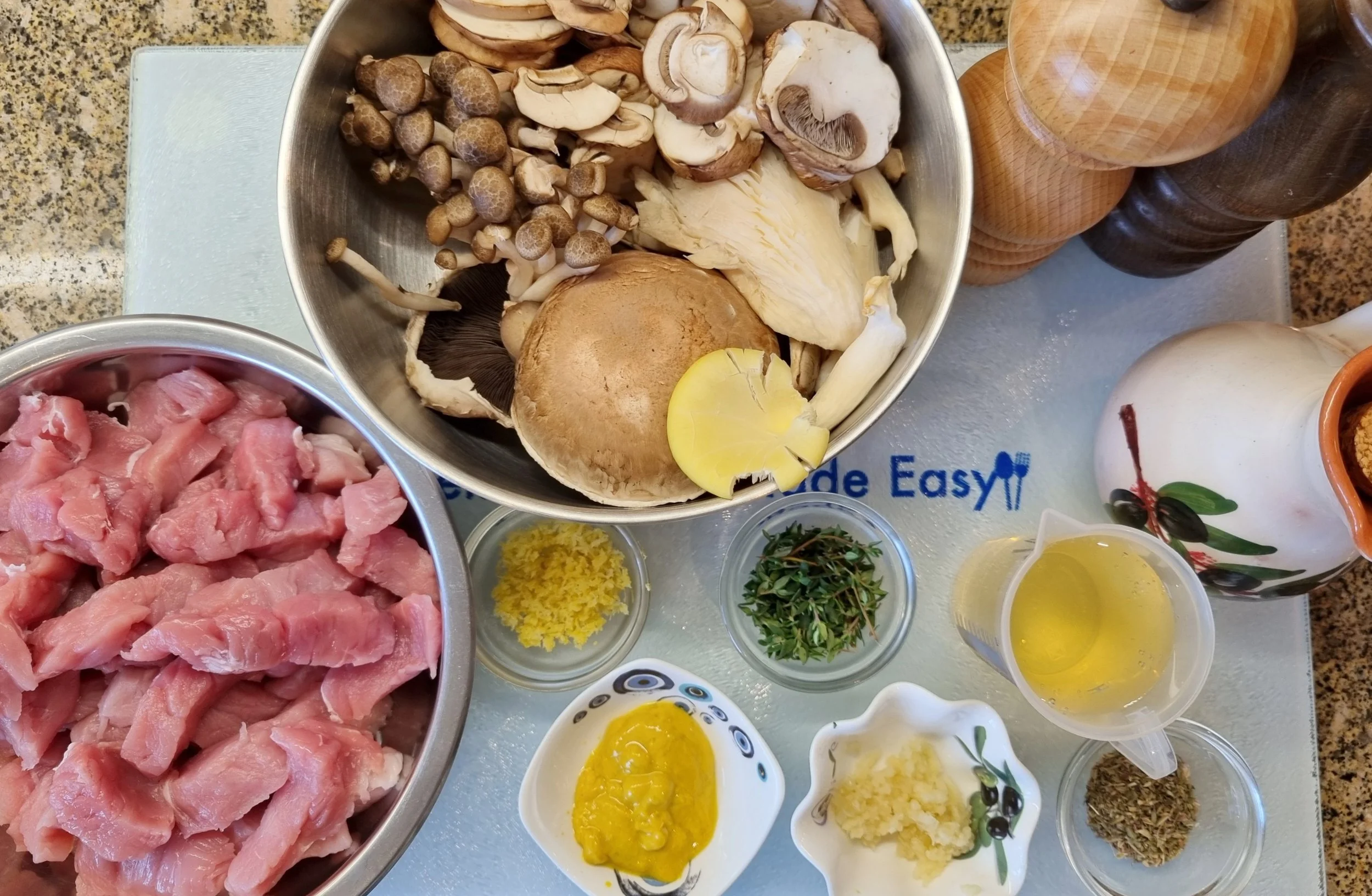 • 600 γρ. / 1 lb 5,5 oz Χοιρινό Ψαρονέφρι, κομμένο σε λεπτές λωρίδες, πάχους 1 εκ.