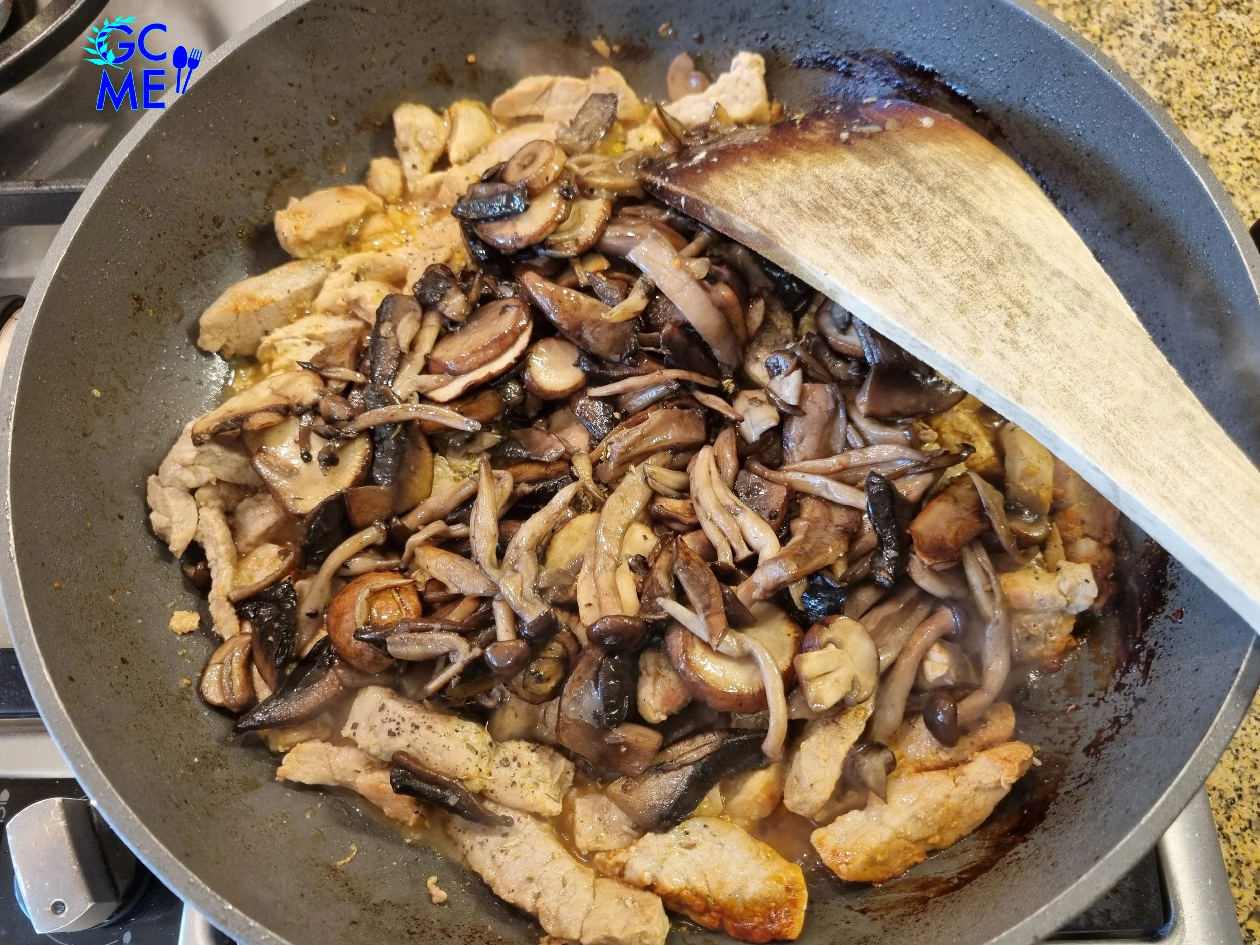 5. When oil is hot, throw in the chopped mushrooms and sauté them for 2'-3' on one side before flipping them.