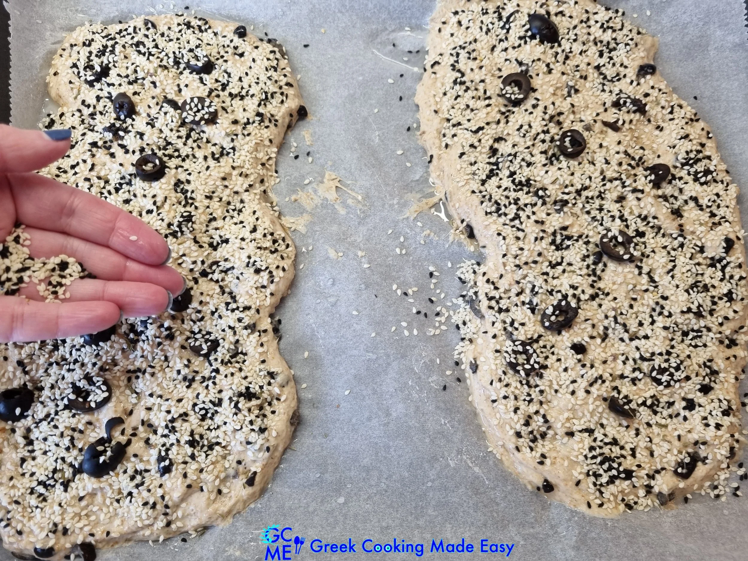23. Πασπαλίστε από πάνω τις ροδέλες ελιάς (που περίσσεψαν) και το υπόλοιπο θρούμπι, και μετά το σουσάμι και μαυροκούκι.