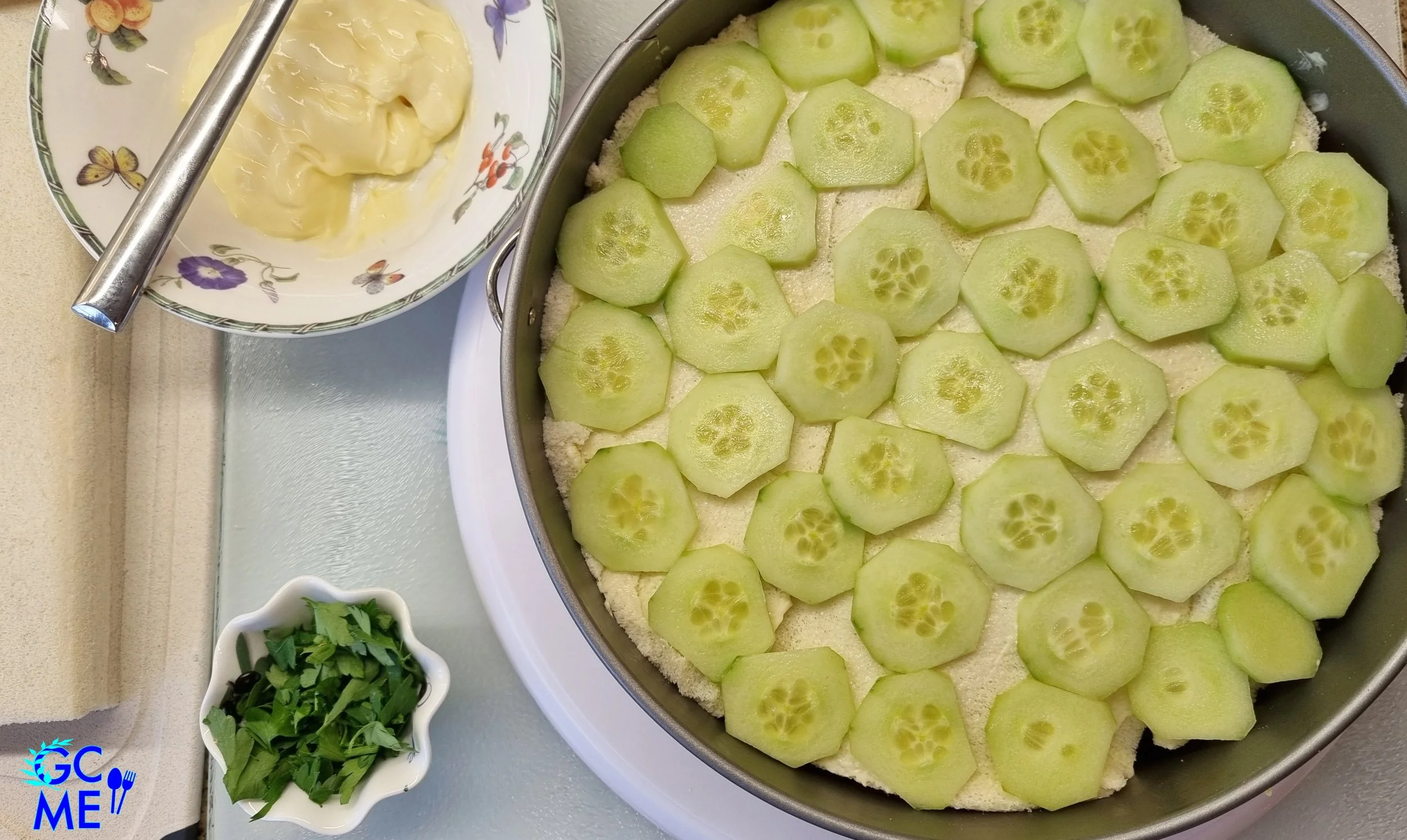 9. Τοποθετήστε μια 2η στρώση από φέτες ψωμιού καλυμμένες με λίγη μαγιονέζα και στη συνέχεια μια στρώση από ροδέλες αγγούρι.