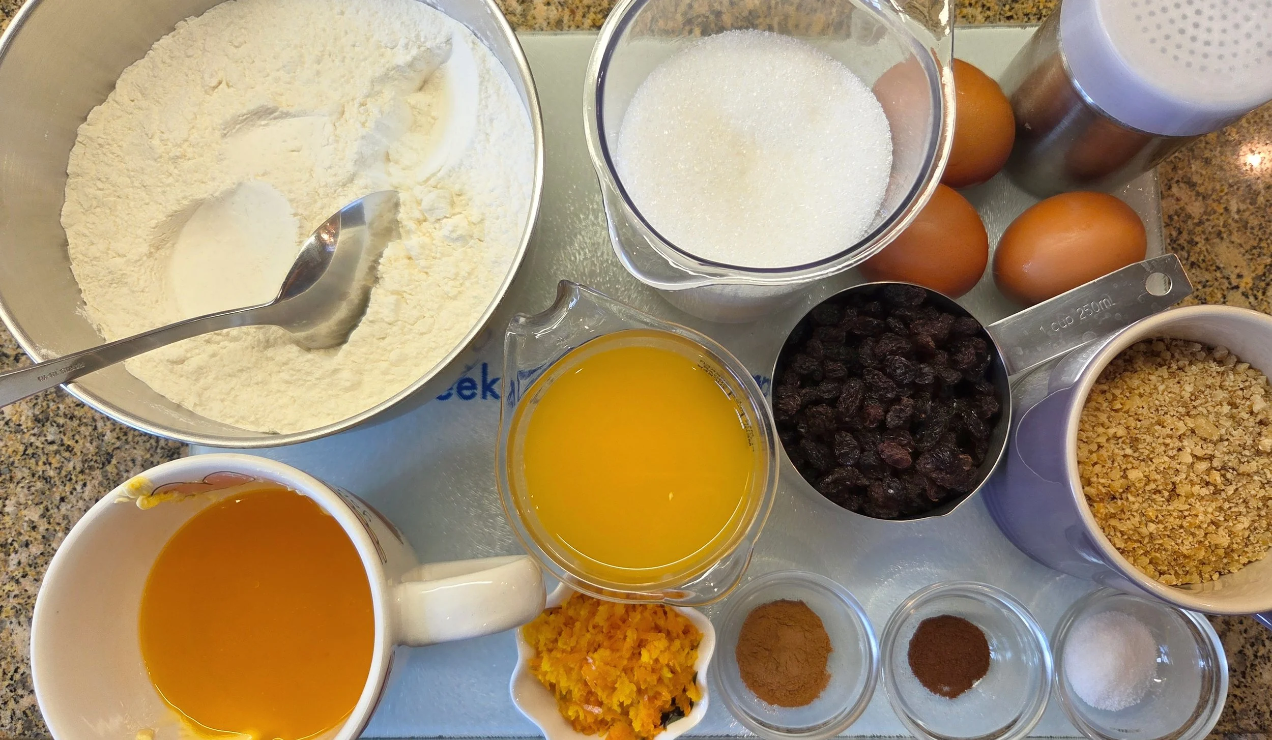 It's actually an easy to prepare Cake and when baked it turns fluffy, rich in taste, moist from the orange juice and raisins, nutty and slightly spicy from the walnuts, cinnamon and cloves.